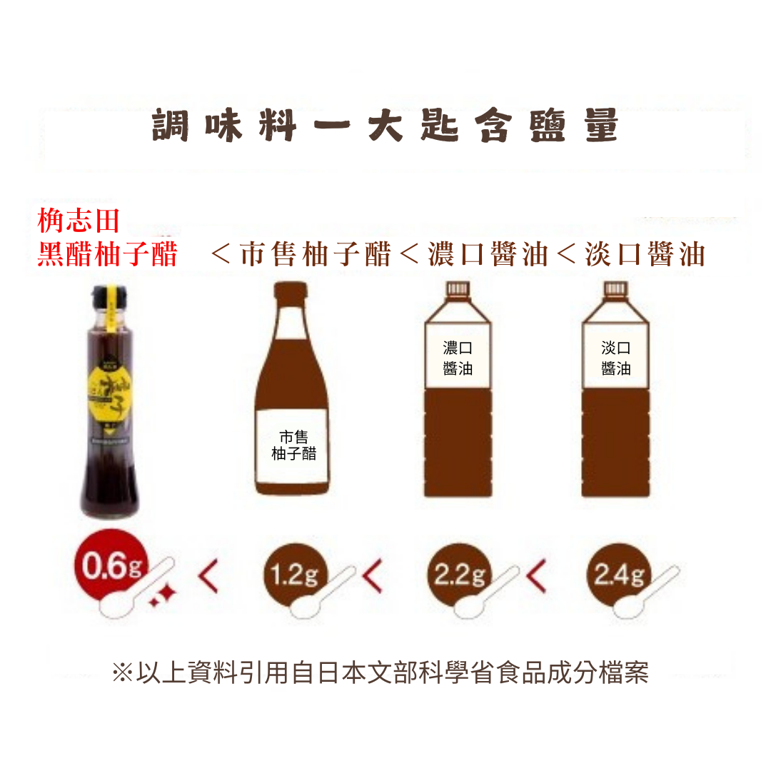 以三年熟成黑醋為基底,胺基酸含量高,味道十分鮮美黑醋的溫醇口感、鹹淡適中的口味能為食材帶來更多的層次加入新鮮柚子汁和柴魚昆布高湯調和,香氣豐富、用途多元其中含有長期黑醋所帶來的營養成分,藉由吃飯就能輕鬆攝取